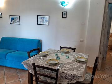 ingresso pedonale, veranda coperta con divnaetto esterno e tavolo e sedie per pranzare e cenare all'esterno, soggiorno con angolo cottura fornito di tv, lavastoviglie, frogorifero, fornoa microonde, divano letto matrimoniale, disimpegno, camera matrimoniale, camera doppia, e bagno con doccia e lavatrice