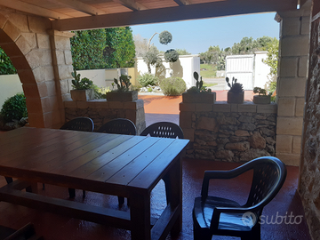 Affitto a Torre dell'Orso villetta con due camere da letto, con 5 posti letto comodi, due bagni con box doccia ampio, tinello attrezzato con piano cottura. Il villino è con veranda e posto auto. Il giardino è grande, con tettoia 7 x 4, altalena, doccia esterna con acqua calda, barbecue e sdraio. La casa è completa di condizionatore, lavatrice, ferro con asse da stiro, 2 phon per capelli, frullatore a immersione, microonde, 2 TV, frigo, forno, piatti, stoviglie eccetera. La casa è tenuta in ottime condizioni, c'è tutto l'occorrente per cucinare per 6-8 persone, cuscini e materassi sono nuovi. È