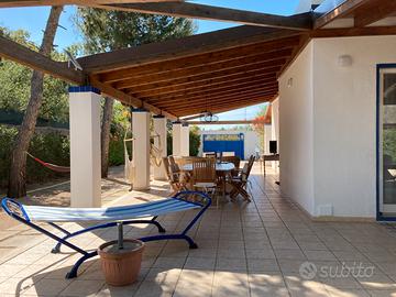 Affittasi villino unifamiliare a due passi dal mare, posizionato all'interno di un giardino di 1000 metri con tanto verde e di uso esclusivo in via Monte Civetta. Gli ambienti interni sono: soggiorno, cucinino, due camere da letto, disimpegno, bagno e ripostiglio, tutti muniti di zanzariere. I posti letto sono 4+2. La villetta è allacciata alla rete idrica pubblica con acqua potabile, no cisterna. Essa è munita dei seguenti accessori: condizionatori nelle camere, forno, microonde, frigorifero ampio, lavastoviglie e lavatrice, asciugacapelli, ferro e asse da stiro, barbecue e televisori dentro e fuori sotto i porticati. L'abitazione è contornata da ampi porticati con tavoli in legno, salotti, amache e altalena ecc. per un maggiore confort e relax dopo una giornata al mare. Giardino, casa e parcheggio auto sono di uso esclusivo unifamiliare. La villetta è ubicata a pochi chilometri dalle città di Lecce, Gallipoli, Taranto, Brindisi, Otranto, oltre ai paesini del parco del negramaro con tutti gli eventi enogastromici. Tutti i consumi energetici sono inclusi.
