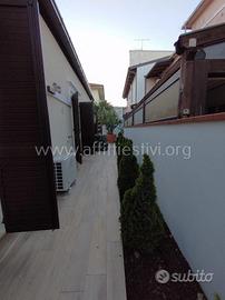 Villetta composta da due camere, di cui una con letto matrimoniale e una con due letti singoli, un soggiorno con divano letto a due piazze, una cucina abitabile, due bagni, per un totale di 100 mq. Si trova a soli 50 mt. dal mare in posizione centrale, in zona silenziosa e servita, è annesso un patio arredato, separato da un area ad uso parcheggio, non fornita e divisa da un divisorio. inoltre vi sono dei ripostigli e un terzo bagno esterno. In dotazione tv, lavatrice, lavastoviglie, aria condizionata