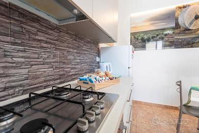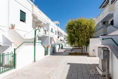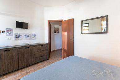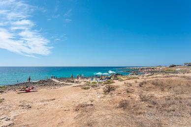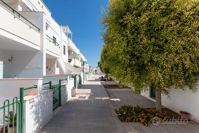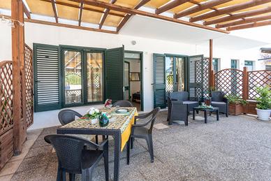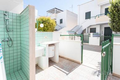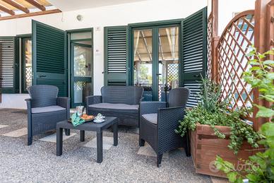 La villetta dispone di due ingressi indipendenti, fronte e retro, che garantiscono comodità e privacy. All'interno si trova una cucina attrezzata con accesso diretto a uno spazio esterno, dove è presente anche una doccia all'aperto, ideale dopo una giornata di mare. La zona notte è composta da due camere da letto: una matrimoniale e una tripla con letto a castello e letto singolo. Dalle camere si accede a una graziosa veranda esterna, perfetta per pranzi e cene all'aperto in totale tranquillità.