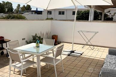 Villetta con spazio esterno e vista mare in lontananza, in affitto a Villaggio Boncore in Salento: a pochi minuti dalle incantevoli spiagge di Torre Lapillo, questa villetta è la scelta perfetta per chi desidera una vacanza all'insegna del relax, del comfort e della bellezza del Salento.