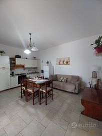 -un soggiorno arredato con tavolo da pranzo, angolo cucina completo e accessoriato con forno e angolo relax con divano e tv;