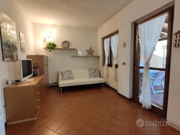 A Santa Margherita di Pula, 120 m. dalla spiaggia, luminoso villino al piano terra con giardino fronte e retro (+ampio posto auto) immerso in una bellissima pineta.