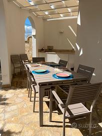 Al piano terra un bel soggiorno con cucina, divano letto per 2, un ulteriore bagno con doccia ed un bellissimo cortile con patio, tavolo e sedie, 2 sdraie per piscina, lavandino e possibilità di fornello portatile ad induzione per cucinare anche all'esterno e BBQ.