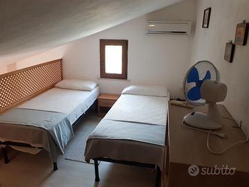 AFFITASI a settembre villino situato all'interno del villaggio di Calaverde, in località Santa Margherita di Pula. E' capo schiera proprio di fronte al porticciolo di Calaverde , e dalla veranda e dal salone potrete ammirare direttamente il mare. E' disposta su 2 livelli, dei quali al piano terra si trova il soggiorno , con cucina e zona pranzo, e adiacente veranda coperta, con la possibilità di pranzare all'esterno. Al primo piano si trova la zona notte composta da 2 camere per un totale di 4 posti letto (più una culla su richiesta) , e bagno con doccia. Le camere sono dotate di condizionatore e zanzariere alle finestre . Su richiesta viene fornita la biancheria e asciugamani da bagno. Il soggiorno è dotato dei confort necessari , quali climatizzatore, TV, frigo con piccolo freezer, lavatrice, cucina a gas, macchinetta del caffè, e forno a microonde. In giardino, sul lato estremo del villino si trova una cisterna da 1000 lt, con pompa autoclave in caso venga a mancare l'acqua. E' presente inoltre un barbecue in muratura dove potrete fare delle grigliate ed anche arrosti più impegnativi. Il villino ha a disposizione un posto auto privato, all'interno della comunione. La Comunione Calaverde offre diversi servizi quali: piscina condominiale (aperta nei mesi di luglio e agosto con servizio bagnino), 2 campi da tennis, campo basket, e calcetto. Parco giochi per bambini e ping pong per adolescenti. Nella bellissima spiaggia è presente il chiosco e servizio noleggio lettini e ombrelloni, mentre nel porticciolo è possibile noleggiare un gommone per escursioni giornaliere , o un posto barca, da richiedere preventivamente al personale del porto. Nella Comunione è presente il personale di assistenza per i servizi comuni. Per info e disponibilità 338 713 8091.