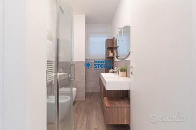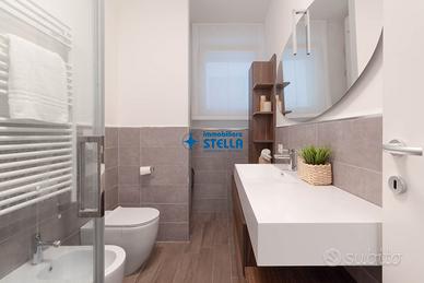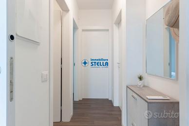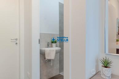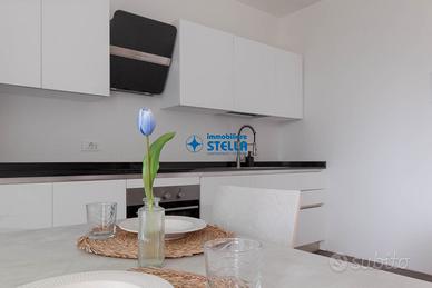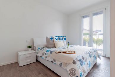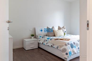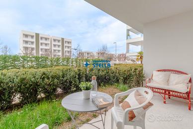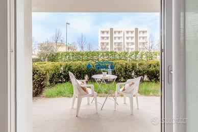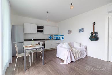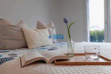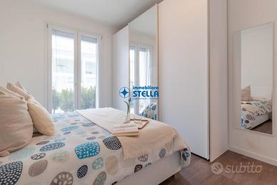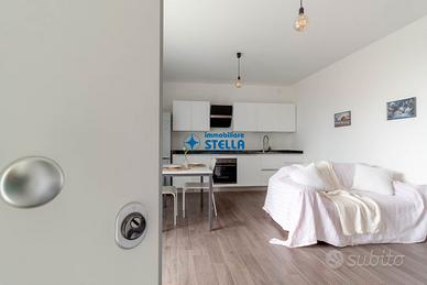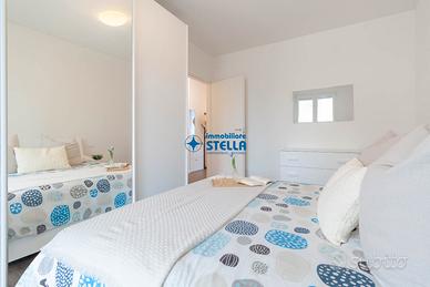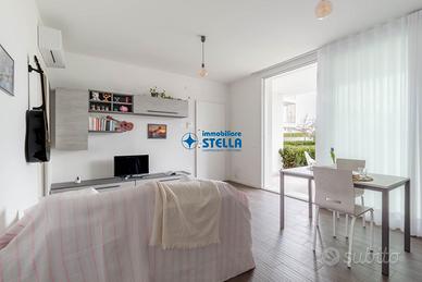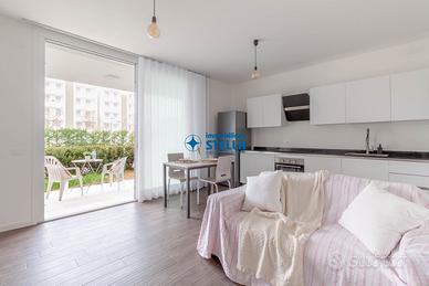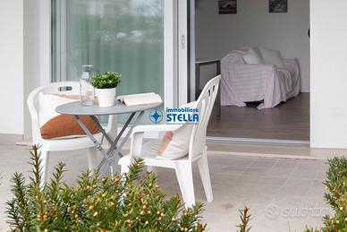 Appartamento in villaggio di nuova costruzione con piscina ubicato in zona Piazza Milano. L' immobile, arredato modernamente, è situato al piano terra ed è composto da una spaziosa zona giorno con cucina abitabile e divano letto, una camera matrimoniale ed un bagno finestrato. La zona living si estende all'esterno tramite un' ampio scoperto abitabile fronte piscina. Appartamento accessoriato di tv, forno, lavatrice e impianto di climatizzazione. Posto auto n.25 CIN: IT027019B43HKO4YUA CIR: 027019-LOC-11297