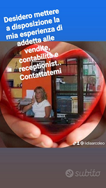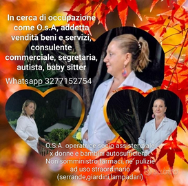 Sono una donna di 56 anni, dinamica, empatica, abituata a lavorare da quando ne avevo 18. Ho acquisito esperienze diverse, come segreteria,amministrazione, responsabile vendita,autista,dama di compagnia e call center. Amo lavorare tra la gente e creare un rapporto armonico. Non mi piacciono i pettegolezzi e le discussioni futili. Sono automunita, abito a Villagrazia di Carini ma mi sposto tranquillamente. Disponibile a lavorare a turni