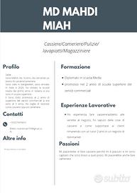 Salve, Sono Mahdi,Ho 16 anni. Sto cercando un lavoro con contratto come apprendista (banconista/cameriere/lavapiatti/pulizie) A milano. Sono disponibile sia per part-time sia per full-time.Ho allegato anche il mio curriculum accanto il mio foto,Grazie