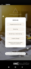 Sono una giovane architetto e project manager con esperienza nella gestione cantieri, laureata con il massimo dei voti e abilitata all'esercizio della professione. Cerco collaborazioni con studi tecnici, imprese, agenzie immobiliari e qualsiasi altra attività attinente, in qualità di disegnatore CAD, grafico, progettista, renderista ed Interior Designer o giovane professionista per gare d'appalto. Inoltre, sono in procinto di sostenere l'esame come BIM specialist. Realizzo planimetrie in modalità sketch o renderizzate, grazie all'uso di programmi di grafica del pacchetto Adobe. Nelle immagini alcuni dei miei lavori. Inoltre, mi occupo di redazione di relazioni tecniche migliorative per la partecipazione a gare d'appalto pubbliche.