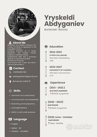 Mi chiamo Yryskeldi, ho 21 anni e sono alla ricerca di lavoro come Bartender / Barista.