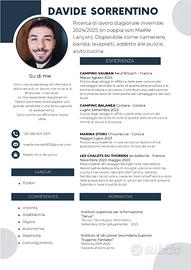 Davide è interessato a posizioni come cameriere, barman, aiuto cucina, pulizie o lavapiatti.