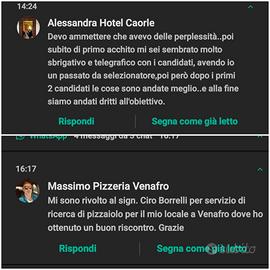 Dopo oltre 28 anni di esperienza nella ristorazione e nel mondo bar con qualifiche di: -Socio AIBES -Master della campari in mixology -Attestato BARTENDER rilasciato dalla regione Campania -Master Manager in F&B (Food & Beverage) -Sommelier con Sommelier Coach Ho deciso di aiutare tutte quelle aziende in difficoltà con: RECUPERO AZIENDALE, FORNIRE RISORSE UMANE, START-UP, PERFEZIONAMENTO DELLA LINEA LAVORO, FORMAT E/O FORMAZIONE DEL PERSONALE. Inoltre dispongo anche di un database di colleghi di lavoro pronti per lavorare in 7 giorni: Barista Barman Bartender Bar manager Direttore bar Direttore ristorante Cameriere Chef de range Commis di sala/cucina runner Pizzaiolo Fornaio Pasticcere Gelataio Rosticcere Lavapiatti Cuoco Capo partita Sous chef Disponibilità OVUNQUE anche per lavoro stagionale fuori la mia zona di Napoli purché sia con vitto e alloggio. Per maggiori informazioni 3345946100