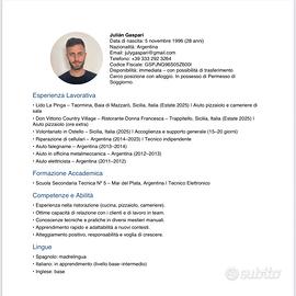 Julian: aiuto pizzaiolo, cucina e cameriere, anche con esperienza nella manutenzione e nell'uso di strumenti e mestieri manuali
