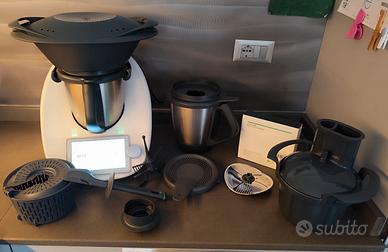 Inclusi tutti gli accessori originali: spatola, misurino, cestello, farfalla, paraspruzzi, varoma, boccale con gruppo coltelli.