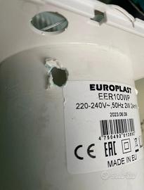 Ventilazione Meccanica Controllata VMC 2 pezzi. Marca Europlast Modello EER100WP (220-24OV, 50Hz 2W - 24m3/H). 2 VMC complete di tutti i componenti, usate e funzionanti. Una è integra e completamente funzionante. L'altra presenta solo 2 pezzi danneggiati e 1 solo appena forato, come da foto, ma facilmente sostituibili con pezzi di ricambio. Il resto dei componenti della seconda VMC sono tutti integri. Il motore della macchina è completamente funzionante. Vendo per passaggio ad altra VMC con controllo Wi-Fi.