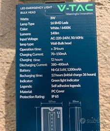 5 lampade di emergenza v-tac 3w led, possibilità di usarle anche sempre accese come uscita di sicurezza. Nuove con scatolo mai aperte. Disponibilità 5 pezzi al prezzo di €50 tutti e cinque. Per altre informazioni chiamare il 3421894240