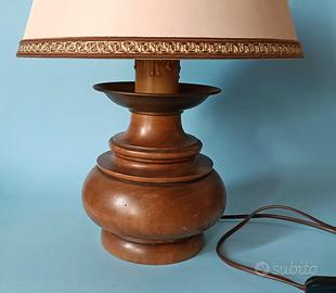 Abat-jour Paralume Lampada Da Tavolo Anni 80 Legno e ottone - Vintage Altezza totale 42 cm - Altezza fusto in legno 20 cm - Altezza Paralume 18 cm Diametro base legno 13 cm - Diametri paralume 29 e 18 cm Lunghezza filo elettrico 100 cm Attacco lampade E 27 Paralume classico in materiale Tela beige Bordo oro Su richiesta è possibile vendere anche senza paralume (Da concordare)