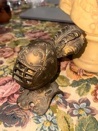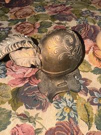 Questo è un accendino da tavolo vintage in ottone con la forma di un elmo di cavaliere.
