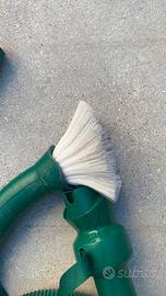 Set di accessori originali Vorwerk per Folletto, comprensivo di tubo flessibile estendibile, prolunga rigida, spazzola triangolare con setole, bocchetta tonda con setole morbide e supporto. Ideali per pulizia di angoli, superfici delicate e mobili. Buone condizioni generali, perfettamente funzionanti.