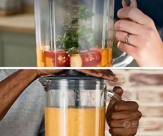 Miscela gli ingredienti caldi o freddi per zuppe o frullati. Il frullatore in vetro ThermoResist™ da 1,6L è in grado di frullare minestre versate direttamente dalla pentola bollente o di tritare il ghiaccio preso direttamente dal congelatore senza rischiare appannamento o frantumazione. Ottieni miscele di consistenza ancora più densa e omogenea con l’apposito mescolatore fornito in dotazione