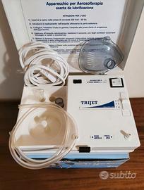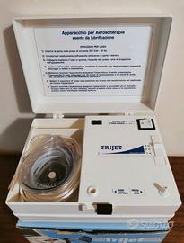 Macchina per aerosol terapia Trijet, in dotazione 1 mascherina sterilizzabile, 1 tubo in gomma per il collegamento dell'aria dall'apparecchio all'ampolla, 1 prolunga in vetro pirex.