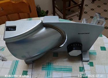...solo accesa (è nuova) ha 2 velocità e 20 rgolazioni di taglio (spessore) con cassetto contenitore. E' creata per affettare salumi e carne, ma ci puoi anche affettare dalle carote alle melanzane. E' nuova solo provata, la vendo solo per motivi di spazio. buon acquisto.( manca il cartone).