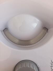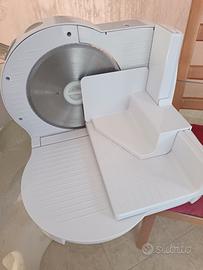 Manopola laterale per decidere lo spessore della fetta, lama in acciaio inox ultra-affilata e carrello scorrevole, pressasalumi protettivo per affettare in totale sicurezza, manuale d'istruzioni originale.