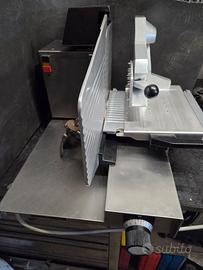 Affettatrice professionale lama 35 cm struttura e piatto salume in acciaio Inox Alimentazione 380volt presente sicurezze a norma x attività necessità di un banco con 80 cm di profondità