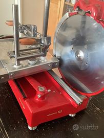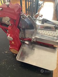 Affettatrice manuale completamente meccanica Tomaga Imperial I33 diametro lama 330 mm Capacità a tagliare un prosciutto intero. Decorazione in ottone.ha bisogno di un tavolo di soli 60 cm. Facile da pulire con elementi smontabili e adatti a lavastoviglie . Prodotto unico molto raro in colore rosso .