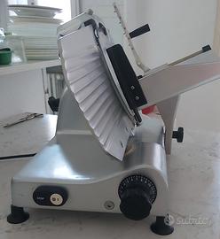 Affettatrice TGL 250 costruita in Italia, struttura in alluminio, garantisce un taglio simile ai modelli usati dai salumieri, con piatto proteggi lama e carrello, dove vengono appoggiati i salumi per affettarli, smontabili molto facilmente per la pulizia e l'igiene.