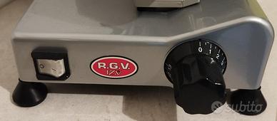 Affettatrice domestica di media dimensione RGV adatta per tagliare salumi formaggi frutta e verdura grazie ad una lama che permette una minore aderenza del prodotto agevolandone il taglio. Questa affettatrice ha 6 anni di età ma è rimasta sempre inutilizzata. Confrontata all'attuale affettatrice della stessa pregiata marca risulta molto più solida. La leva di pressione è totalmente in alluminio e non in plastica come l'attuale affettatrice. Il prodotto che vendo presenta 2 incrinature nell'unica parte in plastica presente che ho fotografato per correttezza. Potenza 120W. Ottimo stato