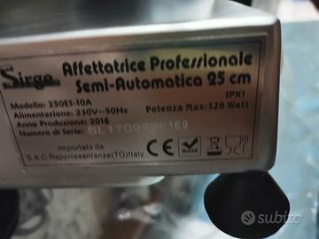 Produttore: SIRGE Modello: 250 ES-10A. IPX1 Potenza motore: 320 Watt Usata pochissime volte, nessuna parte danneggiata, non presenta alcuna imperfezione. Manca solo la scatola di imballaggio. In caso di interesse, disponibili ulteriori foto dell'oggetto. Libretto istruzioni incluso. Nel prezzo non è inclusa la spedizione che è da concordare. Il peso dell'affettatrice è di 20 kg circa.