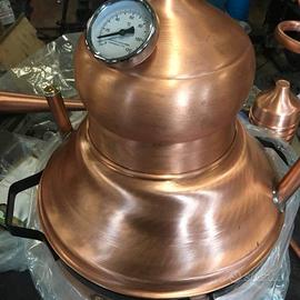 Alambicco distillatore da 25 litri a bagnomaria, tutto in rame massiccio uso alimentare, tubi serpentina uso sanitario, termometro e manici in acciaio installati. Prodotto made in Italy. Spedizione in tutta Italia, contrassegno accettato
