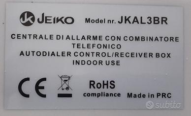 Centrale di allarme Jeiko JKAL3BR con batteria tampone nuova (vedi bolla di spedizione), alimentatore, cavo telefonico, manuale, sensore porte e/o finestre JKAL3DT nuovo (vedi bolla di spedizione) con batteria.