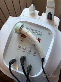 Macchina professionale combinata per trattamenti viso: radiofrequenza e ultrasuoni. Vetri LED per skin scrubber, display timer e intensità, diverse modalità (pulizia, lifting, drenaggio).