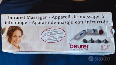 apparecchio per massaggi a raggi infrarossi. Utile per dolori muscolari,affaticamento, disturbi di circolazione. Ha uno snodo che ne permette l' utilizzo in varie posizioni.E' fornito di 4 accessori montabili per il massaggio e un libretto istruzioni. Può essere utilizzato anche solo con infrarossi,senza vibrazione massaggiante. Mai utilizzato in quanto ne possiedo già uno simile.