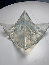 Il vetro spesso ha una forma scultorea a stella/manta con tonalità leggermente ambrata, tipica del design mid-century, probabilmente riconducibile ad AV Mazzega. Oggetto molto decorativo anche da spento.