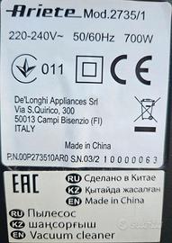Aspirapolvere ARIETE SMART rosso, modello 2735/1 completo di accessori e sacchetti di ricambio. Usato pochissimo, nessun difetto o problema.
