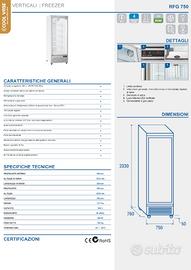 Congelatore verticale con capacità da 560 litri, con corpo in acciaio ed una porta in vetro. Equipaggiato con luce LED verticale con interruttore indipendente, 6 ripiani regolabili, 4 ruote per un facile posizionamento.