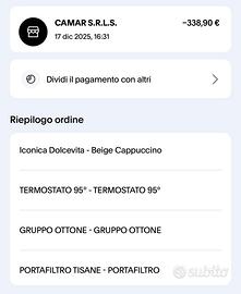 Macchina cialde Aroma iconica dolcevita , acquistata 17 DICEMBRE 2025 , pagata 338€ (listino prezzo 368€) con optional termostato 95 gradi ,termoblocco ottone , secondo portacialde per tisane , la macchina ha anche la funzione standby dopo 9 minuti di inutilizzo si spegne ,fa caffe’ cremoso, vendo per cambio tipologia la macchina ripeto E’ pari al nuovo solo provata per 5/6 caffè, possiedo fattura per la GARANZIA, per info contattatemi possibilità di spedizione.no offerte ridicole grazie #faber#caffe’#aroma plus#borbone#