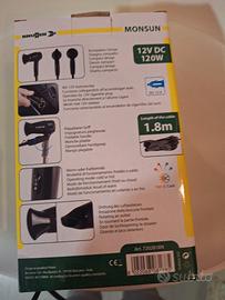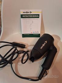 vendo causa initilizzo asciugacapelli da viaggio , impugnatura pieghevole, rotazione della boccola frontale. 12v dc 10a 120w della BRUNER MONSUN. Utilissimo in viaggio collegandolo all accendi sigari, auto/camper/ Roulotte. nuovissimo, integro, funzionante. scatola originale e libretto istruzioni
