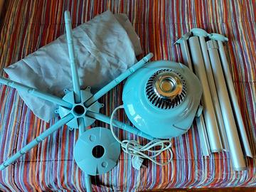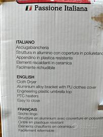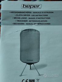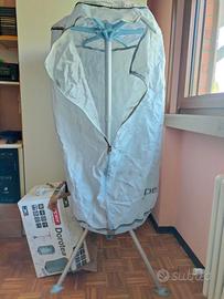 Asciuga in modo statico evitando pieghe e frizioni ed è equipaggiato con dispositivo antisurriscaldamento, antidispersione di corrente elettrica e autospegnimento. Azione antiallergica: le alte temperature hanno un’azione antibatterica, antipolvere e tengono lontani gli insetti. Alta efficienza: asciuga molto più velocemente che con metodi tradizionali. Trasportabile: facile da montare/smontare, leggero e non particolarmente ingombrante. Il ventilatore determina un gradiente di pressione positivo all’interno della copertura. Il circuito ad aria forzata elimina completamente l’umidità dagli indumenti e spinge le molecole umide verso l’esterno. Composto da : appendiabiti , parte superiore del fusto , parte inferiore del fusto con anello di congiunzione , piatto di copertura motore , insufflatore aria calda ,rotella di comando , fessure di entrata dell’aria , corpo motore , piedini antiscivolo .