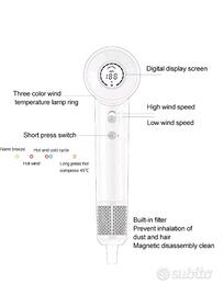 Asciugacapelli OEM agli ioni negativi è dotato di una tecnologia che permette un asciugatura più veloce con risparmio elettrico e vantaggio per la cura dei capelli in quanto elimina l'elettricità statica che rende i capelli secchi e sfibrati a causa degli ioni positivi. Lavora con temperatura costante ed evita surriscaldamento e conseguente danno per i capelli. La potenza del motore di 1600 watt, il motore ha due regolazioni di velocità fino a 110.000 giri al minuto con possibilità di emissione tre livelli di temperatura, aria fredda, aria calda a 50° e aria calda a 70°. Il motore è brushless (senza spazzole). 200 milioni di ioni negativi e regolatore intelligente di temperatura. L' alimentazione è elettrica con spina schuko EU e il tipo di ugello standard. Dotato di display informativo temperatura e velocità. Alla base dell'impugnatura c'è il filtro antipolvere rimovibile per manutenzione e pulizia. Guida utente inclusa nella confezione.
