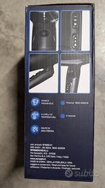 Asciugacapelli professionale potente e compatto, ancora nuovo e mai usato, completo di scatola originale, beccuccio concentratore e manuale d'uso. Grazie al manico pieghevole, è perfetto sia per l'uso quotidiano in casa che da portare in viaggio o in palestra, occupando pochissimo spazio. Caratteristiche tecniche principali: Potenza: Regolabile tra 1800W e 2200W per un'asciugatura rapidissima. Regolazioni: 3 livelli di temperatura e 2 velocità d'aria. Funzione Cold Shot: Tasto per il colpo d'aria fredda, ideale per fissare la piega e ridurre l'effetto crespo. Design: Colore nero lucido, ergonomico e leggero. Accessori: Include il beccuccio per lo styling. L'articolo è perfettamente funzionante, estratto dalla scatola solo per le foto.