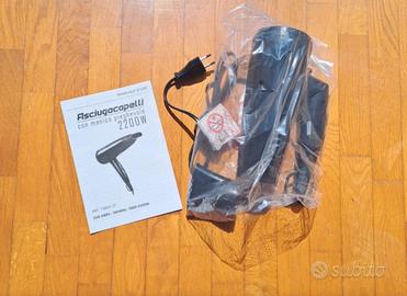 Asciugacapelli con manico pieghevole nuovo, mai utilizzato. Come si vede in foto, non presenta strisci o alcun difetto. A disposizione per ulteriori informazioni o foto.