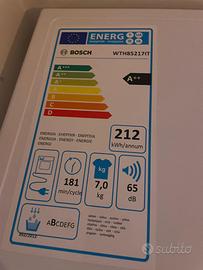 Vendo asciugatrice a pompa di calore Bosch modello WTH85217IT, classe energetica A++. La macchina è di ottima qualità, molto efficiente nei consumi e asciuga perfettamente. CARATTERISTICHE: • Capacità: 7 kg. • Efficienza: Classe A++ (molto economica in bolletta). • Condizioni: Meccanicamente ed elettronicamente perfetta. • Programmi: Molteplici cicli (Cotone, Sintetici, Mix, Rapido 40 min, Lana, ecc.). NOTA SUL DIFETTO: L'unico problema è il gancio della chiusura dell’oblò che si è spezzato (vedi foto). L'asciugatrice funziona correttamente, ma attualmente per far partire il ciclo è necessario appoggiare un peso davanti allo sportello per tenerlo ben accostato. PREZZO TRATTABILE