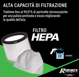 Filtro HEPA intercambiabile e lavabile: l'aspiratutto è dotato di un filtro HEPA in grado di catturare particelle ultrafini e allergeni; inoltre, il prefiltro antistatico e autoestinguente previene la dispersione di polveri e prolunga la durata del filtro