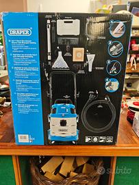 Aspiratore Draper 75442 4 in 1 ideale per la casa, l'officina, l'ufficio e il garage e particolarmente utile per il car valeting. Dotato di un interruttore di aspirazione variabile e di un dispositivo di spruzzatura per la pulizia di tappeti, pavimenti, tappezzeria e superfici dure. Il detergente viene aggiunto sotto forma di spray pressurizzato. Questo pulitore è progettato anche per raccogliere materiale secco. Ha un serbatoio da 20 litri e una capacità di 4 litri di detergente. Dotato di cavo da 10 m (circa) e spina approvata. Questo pulitore viene fornito con i seguenti accessori: sacchetto di carta per la polvere, filtro a cartuccia, filtro anti-schiuma, tubo flessibile da 3 m, tubo di prolunga retrattile in acciaio inox, grilletto ergonomico con funzione di avvio e arresto a distanza, spazzola rotonda, bocchetta per fessure, spazzola multiuso con base in metallo e spazzola retrattile, bocchetta di aspirazione a spruzzo piccola, bocchetta di aspirazione a spruzzo grande + tergipavimento. Tutti gli accessori hanno un diametro di 35 mm