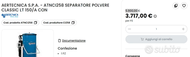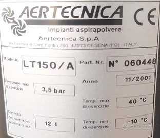 Vendo centrale aspirante Aertecnica LT150/A, ideale per impianti di aspirazione centralizzata domestici. Marca: Aertecnica (Tubò) Modello: LT150/A Condizioni: usato, perfettamente funzionante Perfetto per case, uffici e ambienti dove si desidera pulizia silenziosa e senza ingombri. Spedizione: Disponibile a carico dell'acquirente o ritiro a mano in Roma. E' possibile ritirare il materiale, previo appuntamento, a due passi dall'uscita 10 del GRA, vicino all' IKEA, dal lunedì al venerdì 8-11.30 e 13-16.30. Per qualsiasi domanda potete contattarci negli orari riportati sopra. Ns riferimento: req. 345458-10 B1-FL-C2/2